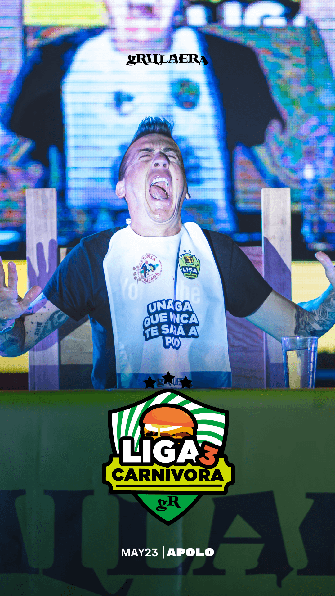 Gran Final de la Tercera Edición de la Liga Carnívora. Concurso de comida creado y organizado por gRILLAERA donde se enfrentan los comedores profesionales más importantes de todos los rincones de España. En esta edición se enfrentaron 5 bicharracos para ver quién se comía una torre de 5 burger de 200gr en menos tiempos.